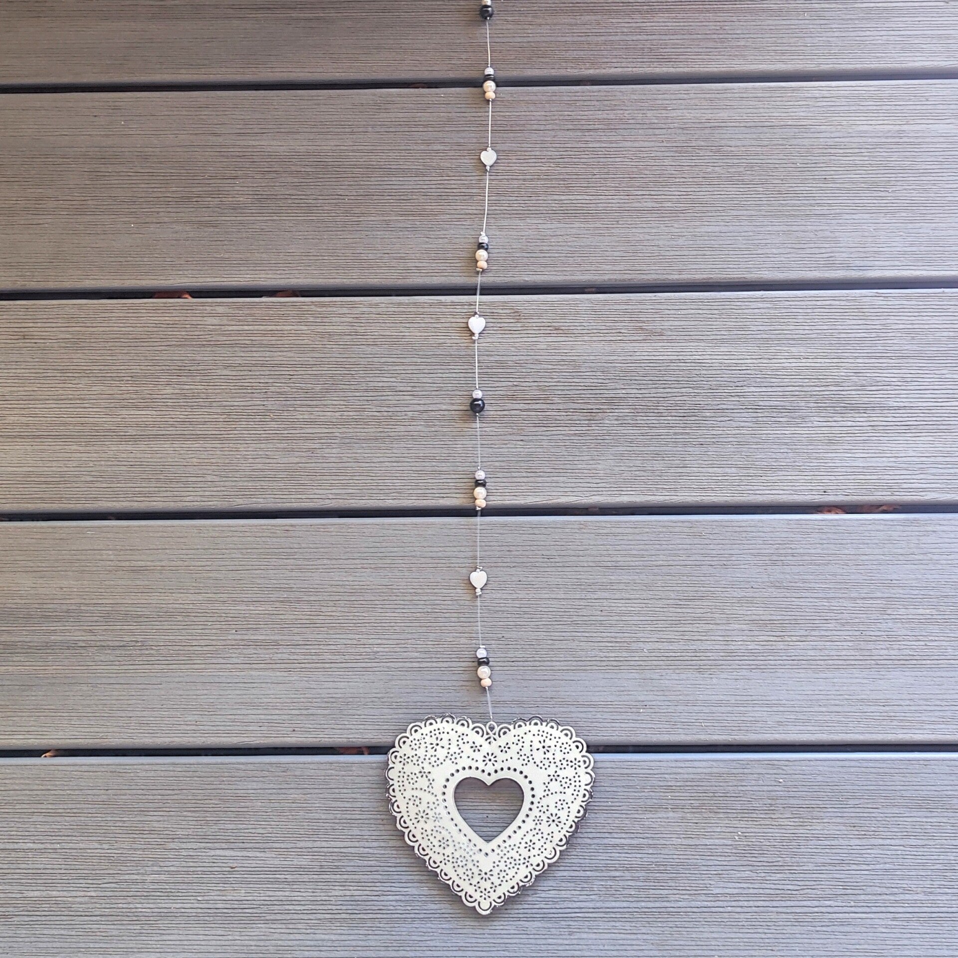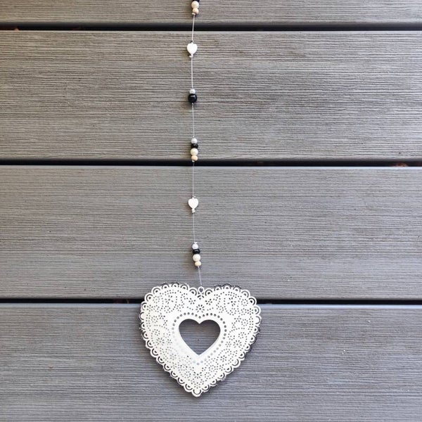 diese Girlande besteht aus einem Metall Shabby Herz mit Rüschenrand und ist mit diversen Perlen in weiss und schwarz bestückt .