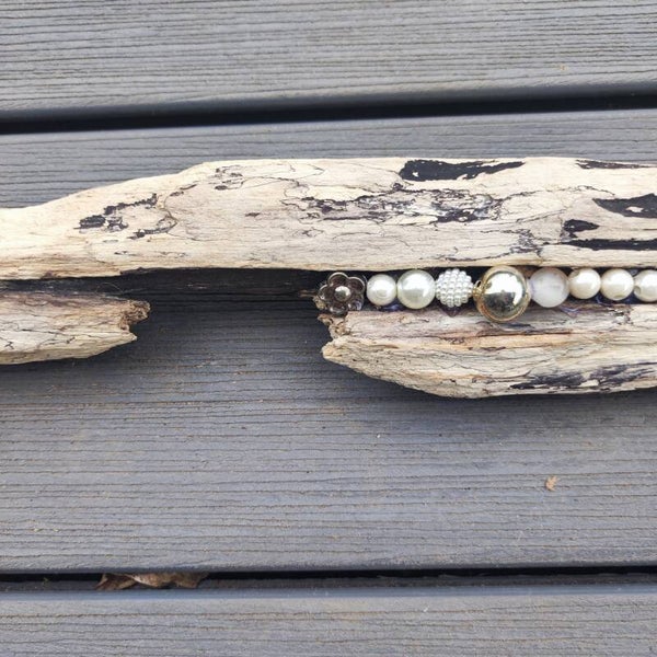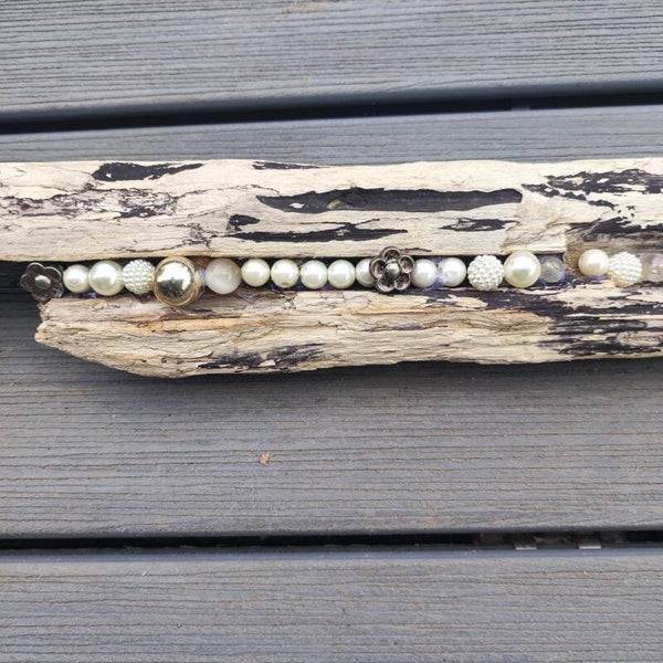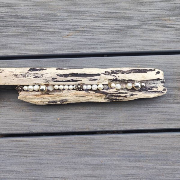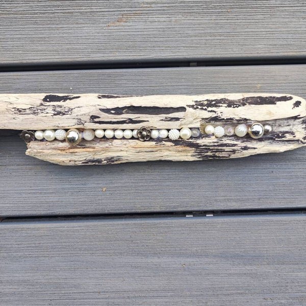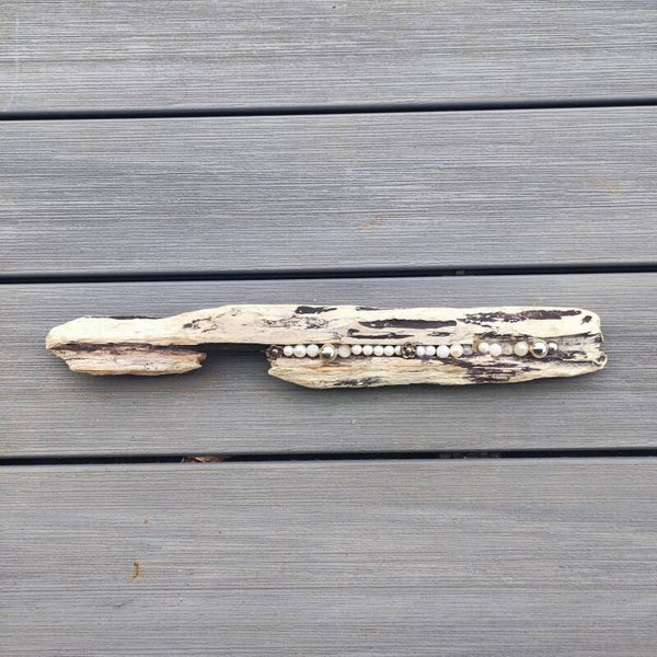 dieses Schwemmholz Unikat besteht aus einem Stück Schwemmholz , dieses habe ich mit verschiedenen Perlen /Murmeln in weiss /creme Nuancen und silber/metallic bestückt .