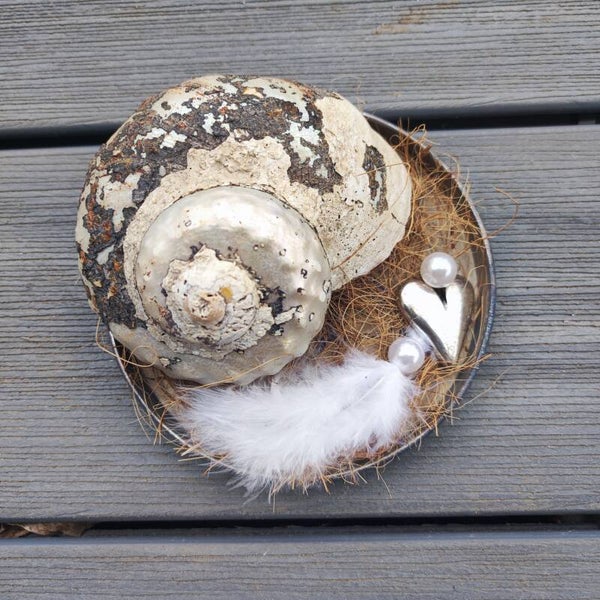 dieses Mitbringsel besteht aus einem Metaltellerchen , den ich mit einem speziellen , grossen Schneckenhaus , Federli und einem Metalherz ausgarniert habe .