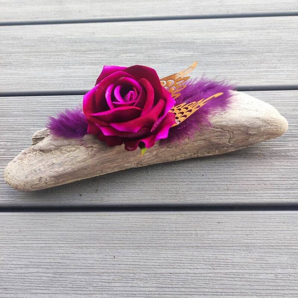 dieses Schwemmholz Unikat besteht aus einem Stück Schwemmholz dieses habe ich mit einer künstlichen Rose , einer violetten Feder und einem rostigen Engelsflügeli aus dekoriert.