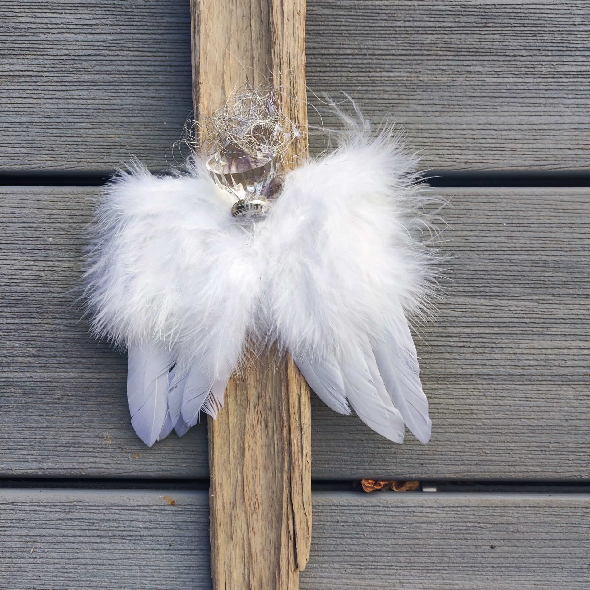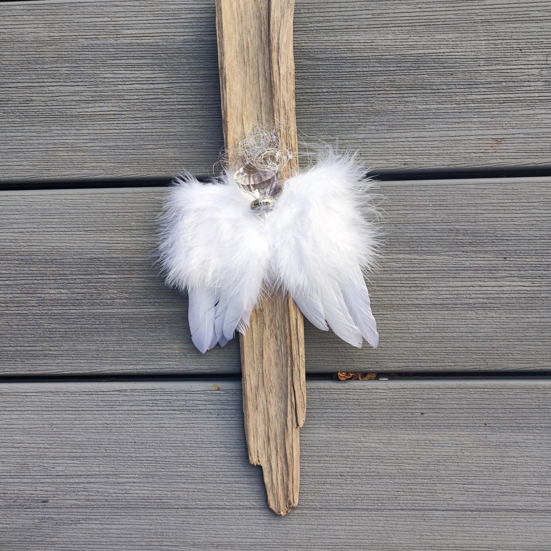 dieses Unikat besteht aus einem Stück Schwemmholz , dieses habe ich mit einem weissen Engelsflügel aus Federn bestückt. Der Kopf besteht aus einer kegelförmigen Perle die mit Engelshaar ergänzt ist