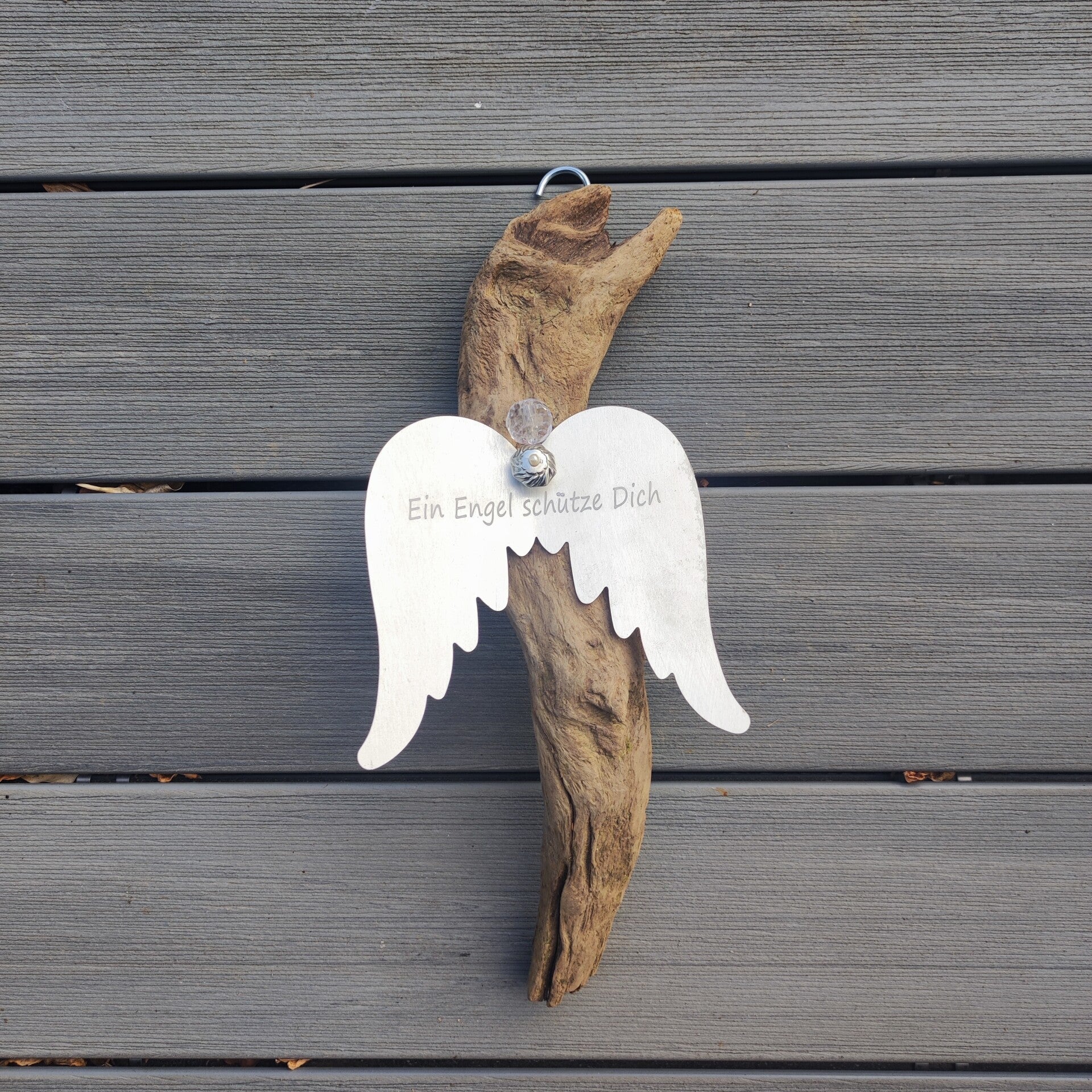 dieses Unikat besteht aus einem Stück gebogenem Schwemmholz , dieses habe ich mit einem Metall Engelsflügel mit Schriftzug bestückt. Der Kopf besteht aus einer silbernen und einer transparenten Perle