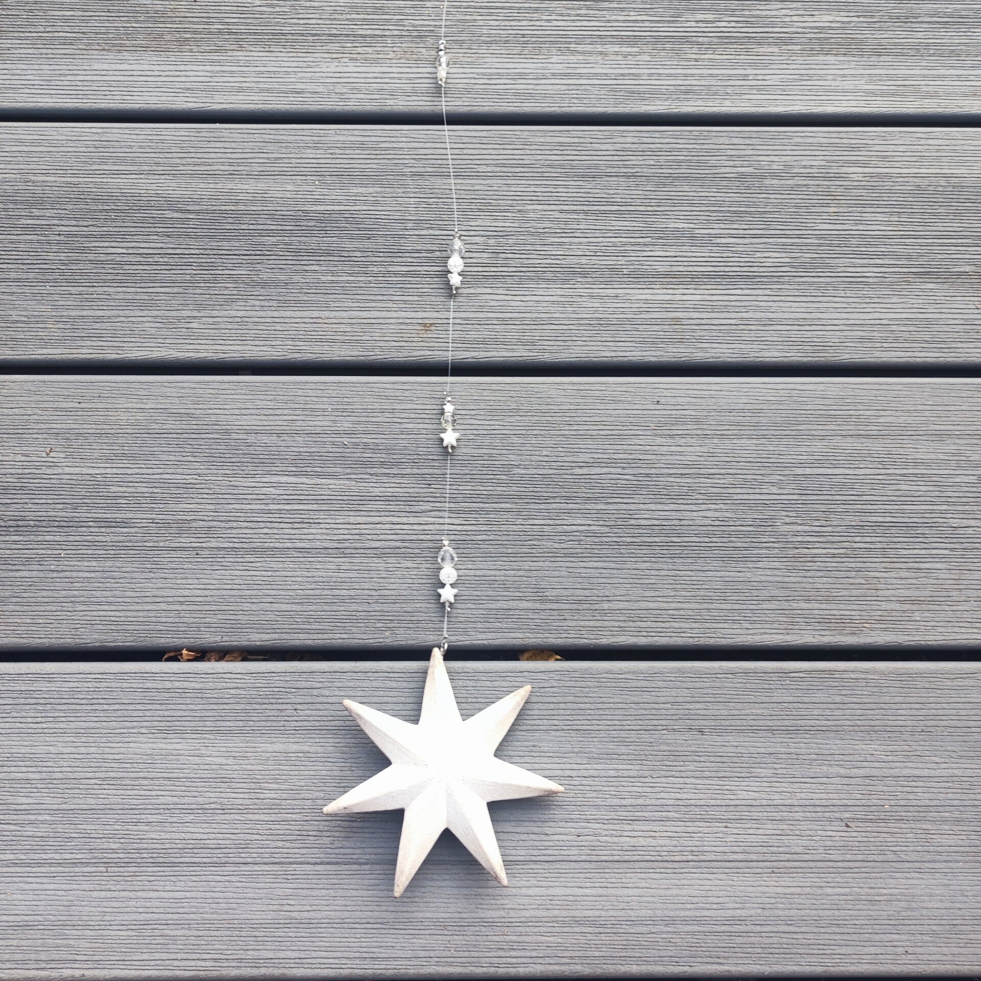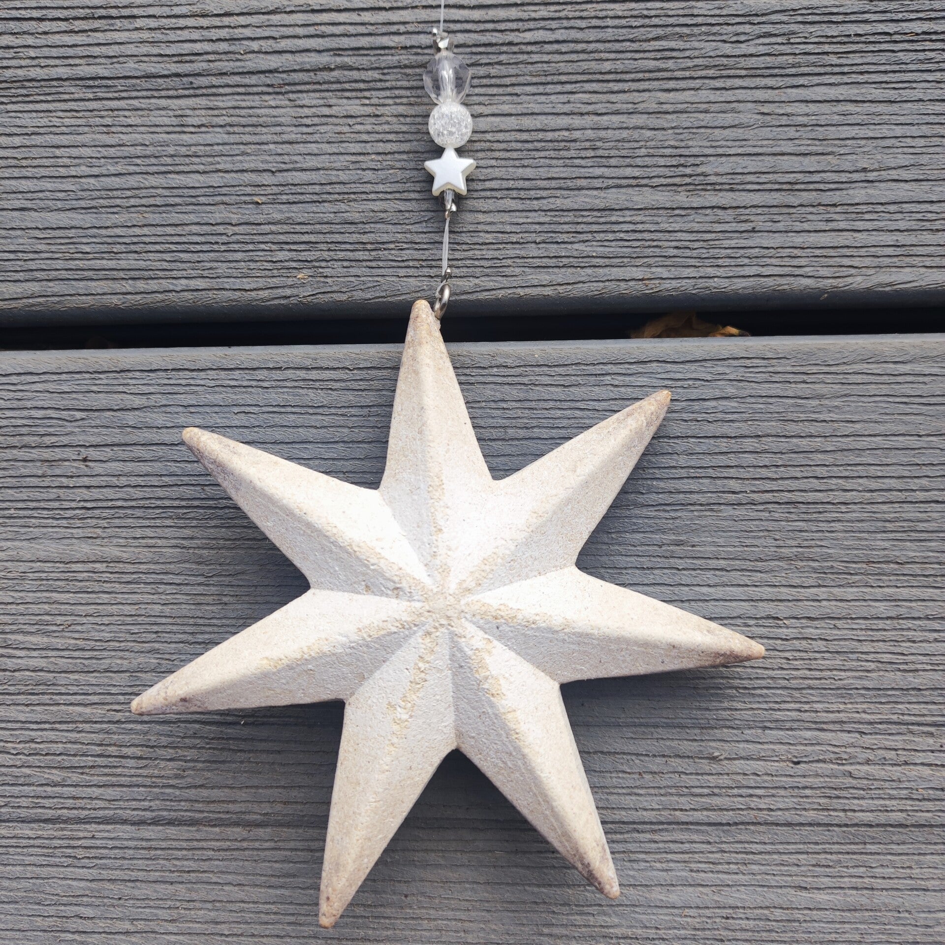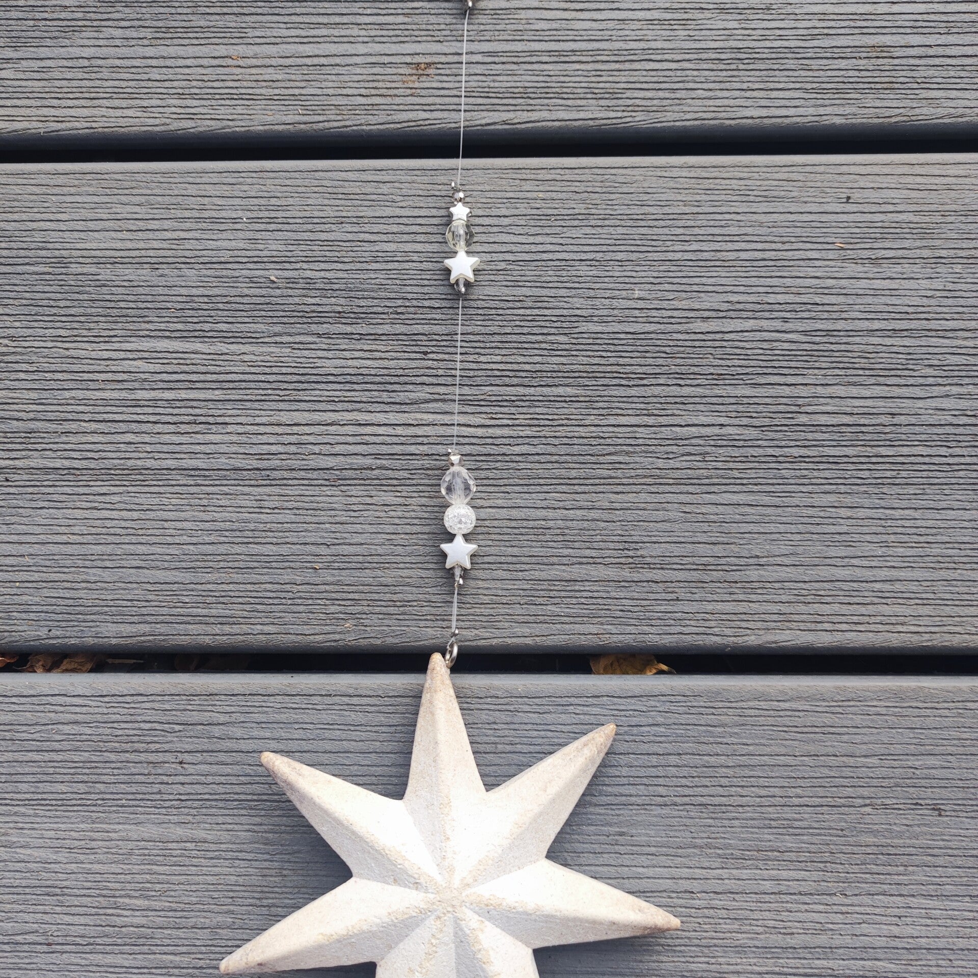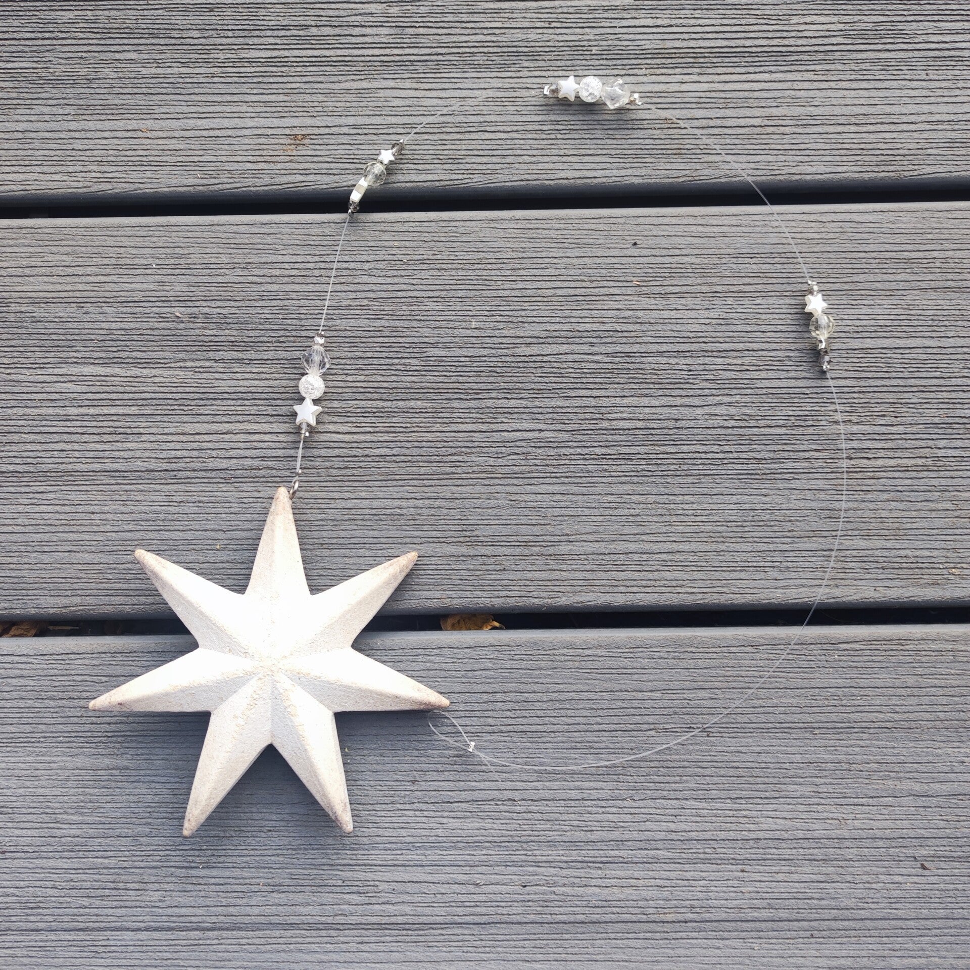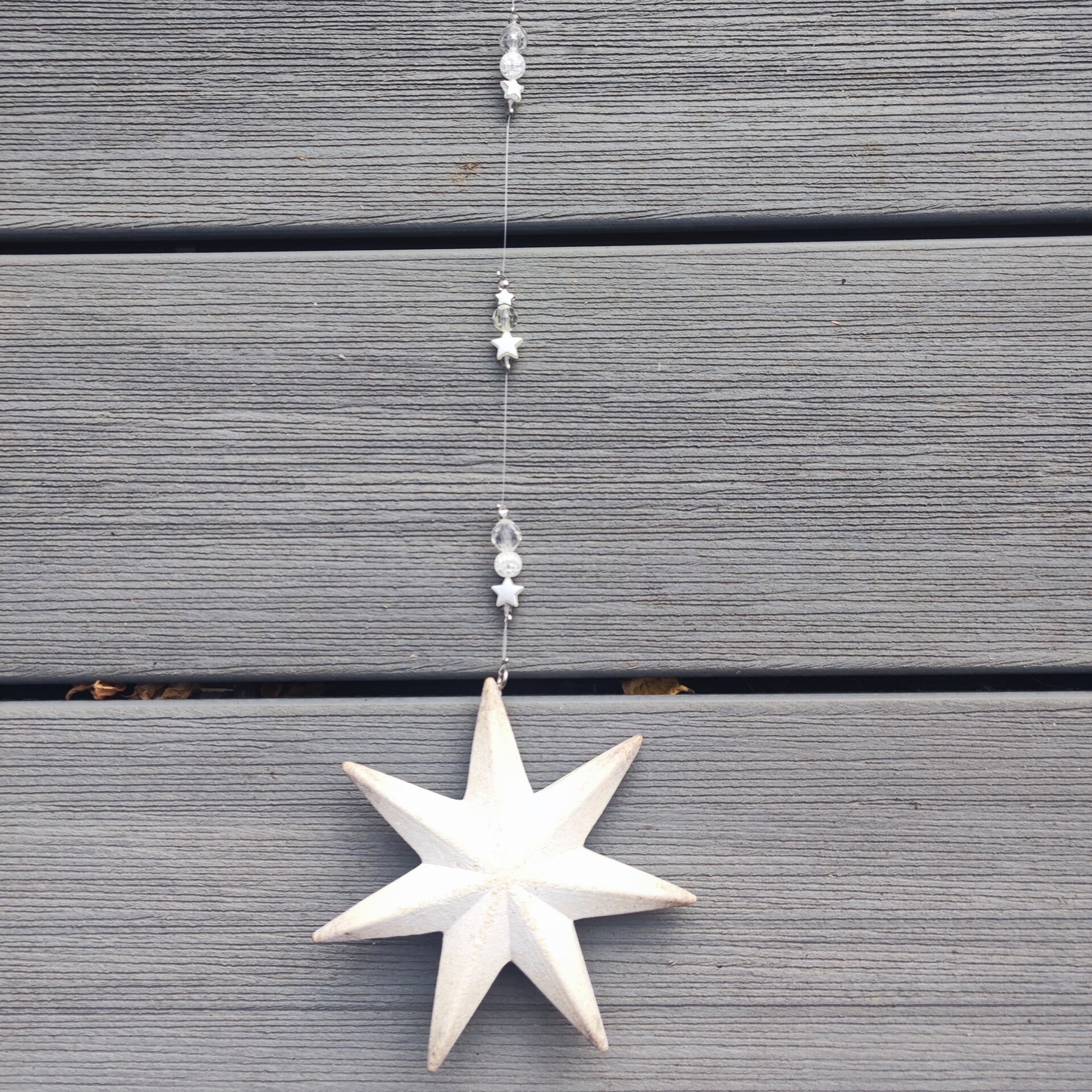 diese Girlande besteht aus einem Metall Stern im Shabby Look. Mit Perlen in weiss , transparent und silber